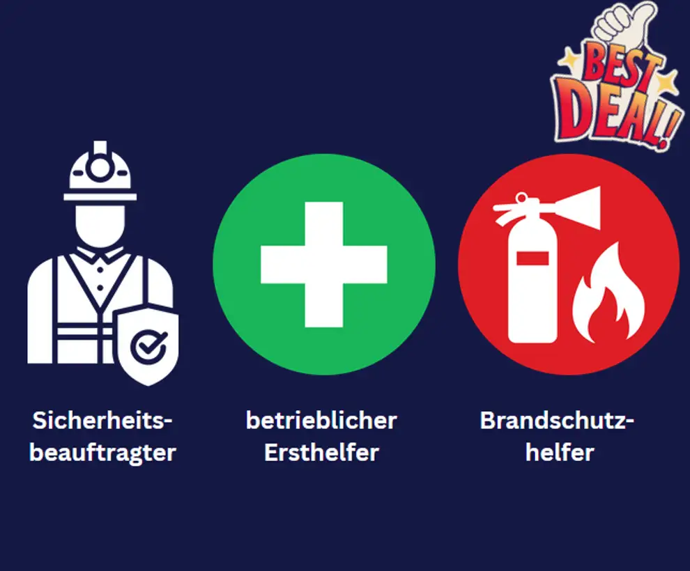 Qualifizierungen zum Sicherheitsbeauftragten, zum Brandschutzhelfer und zum betrieblichen Ersthelfer. 3 Tage –  3 Schulungen – 3 Zertifikate, DGUV- und ASR-konform. Flexibel bei uns oder in Ihrem Unternehmen.